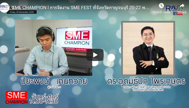 SME CHAMPION l การจัดงาน SME FEST ที่จังหวัดกาญจนบุรี 20-22 พ.ย.63 14.00-14.30 น. ติดตามข่าวสารการส่งเสริม SME กับ ดร.อุดมธิปก ไพรเกษตร (กรรมการผู้จัดการ บริษัท ดิจิทัลบิสิเนส คอนซัลท์ จำกัด) และปิยะพงษ์ เคนทวาย . [20 พฤศจิกายน 2563] #SME_Champion, #วิทยุราชมงคลธัญบุรี, #SME, #เอสเอ็มอี, ...