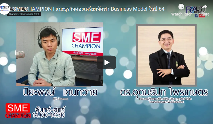 SME CHAMPION l แนะธุรกิจต้องเตรียมจัดทำ Business Model ในปี 64 ดร.อุดมธิปก ไพรเกษตร กรรมการผู้จัดการ บริษัท ดิจิทัลบิสิเนส คอนซัลท์ จำกัด ได้แนะนำวิธีการมองธุรกิจ ติดตามข่าวสารการส่งเสริม SME กับ ดร.อุดมธิปก ไพรเกษตร กรรมการผู้จัดการ บริษัท ดิจิทัลบิสิเนส คอนซัลท์ จำกัด และปิยะพงษ์ เคนทวาย ออกอากาศทุกวันจันทร์-ศุกร์ เวลา 14.00-14.30 น. . [19 พฤศจิกายน 2563] #SME_Champion, #วิทยุราชมงคลธัญบุรี, #SME, #เอสเอ็มอี, ...
