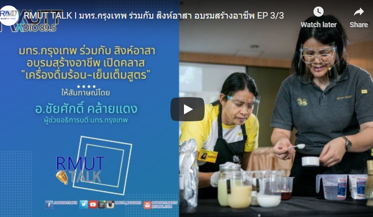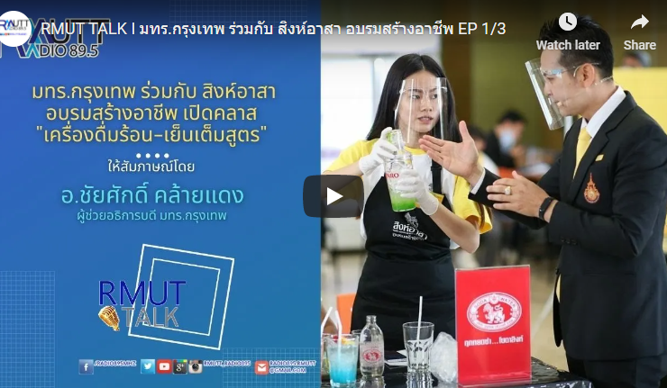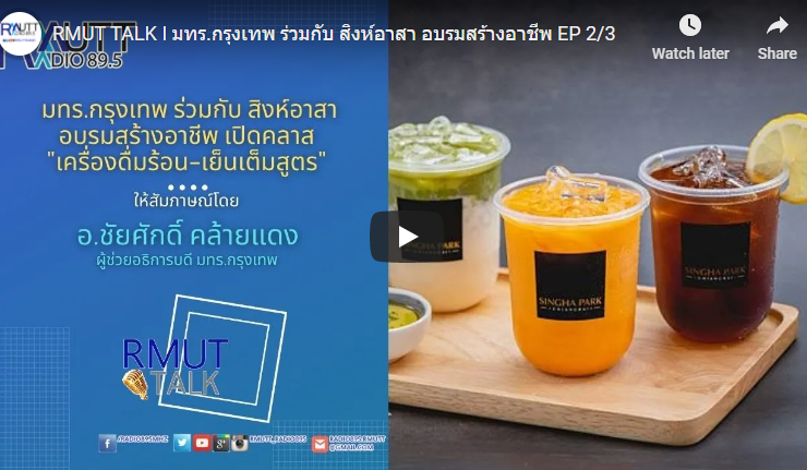 RMUT TALK I มทร.กรุงเทพ ร่วมกับ สิงห์อาสา อบรมสร้างอาชีพ EP 3/3 สัมภาษณ์ อ.ชัยศักดิ์ คล้ายแดง ผู้ช่วยอธิการบดี มทร.กรุงเทพ สิงห์อาสาอบรมสร้างอาชีพ เปิดหลักสูตรที่สอง “เครื่องดื่มร้อน-เย็นเต็มสูตร” ทั้งกลุ่มอิตาเลียนโซดา กลุ่มชา เป็นการนำศักยภาพของบริษัทในเครือ ได้แก่ โซดาสิงห์, ทีมบาริสต้าจากสิงห์ปาร์ค เชียงราย, ทีม R&D จากร้านฟาร์มดีไซน์ ร่วมกับ 2 มหาวิทยาลัยเครือข่ายสิงห์อาสา โดยทีมอาจารย์มหาวิทยาลัยเทคโนโลยี ราชมงคลกรุงเทพ และทีมอาจารย์มหาวิทยาลัยแม่ฟ้าหลวง เดินหน้าพัฒนาทักษะวิชาชีพด้านอาหารให้แก่ผู้ที่ได้รับผลกระทบจากพิษโควิด-19 สามารถดูรายละเอียดเพิ่มเติมเกี่ยวได้ที่ สิงห์อาสาอบรมสร้างอาชีพ ทางวิทยุราขชมงคลธัญบุรี FM 89.5MHZ Website ...