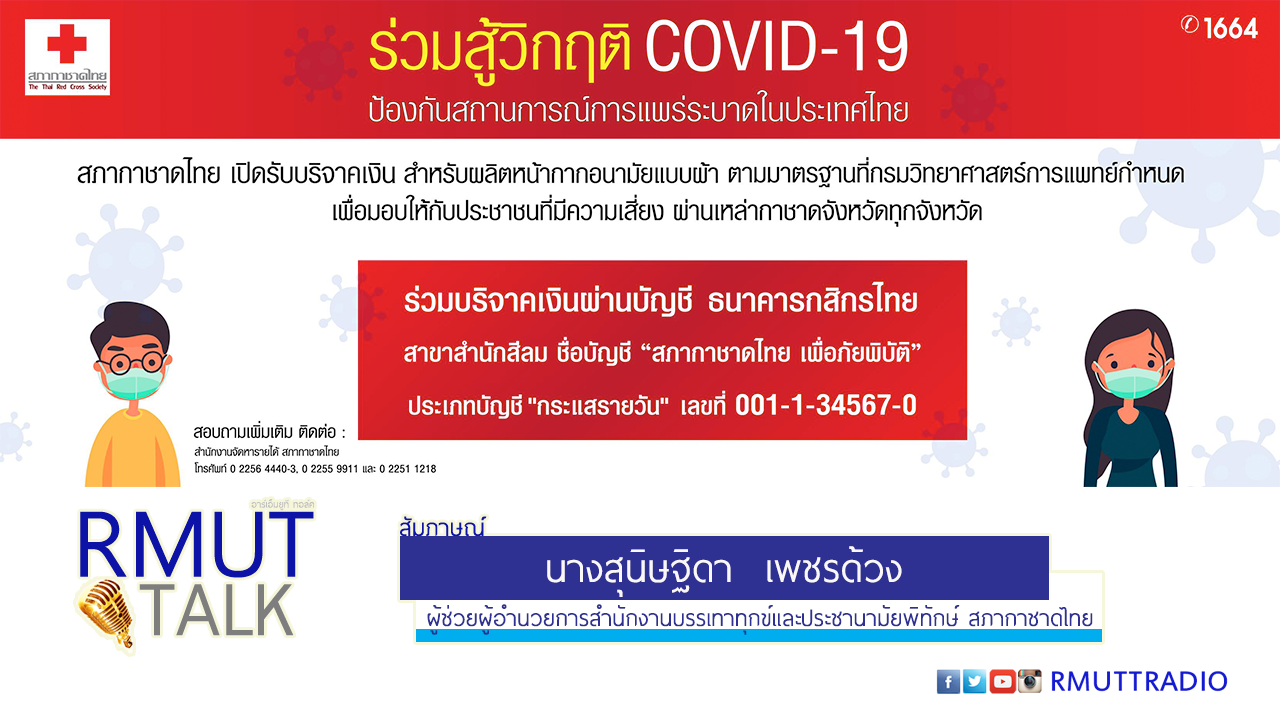 คณะอุตสาหกรรมสิ่งทอและออกแบบแฟชั่น มหาวิทยาลัยเทคโนโลยีราชมงคลพระนคร นำโดยคณบดีคณะอุตสาหกรรมสิ่งทอและออกแบบแฟชั่น ได้ผลิตหน้ากากอนามัยสำหรับถวายแด่พระภิกษุ จำนวน 2,000 ชิ้น ซึ่งมีนักศึกษา อาจารย์ ร่วมกันผลิต ในการนี้ทางคณะฯได้รับการสนันสนุนผ้าจากบริษัท อะเม้าท์พลัส 2009 จำกัด โดยคุณเสรี เซี่ยงจง กับ นส.วงเดือน จาตุรนต์ ศิษย์เก่าของคณะฯ ซึ่งหน้ากากดังกล่าวเมื่อตัดเย็บเสร็จเป็นที่เรียบร้อยแล้ว รศ.สุภัทรา โกไศยกานนท์ รักษาราชการแทนอธิการบดีมหาวิทยาลัยเทคโนโลยีราชมงคลพระนคร จะนำไปถวายแก่พระภิกษุต่อไป ณัฐภัทรพล จุติการพาณิชย์ วิทยุราชมงคลพระนคร รายงาน ...