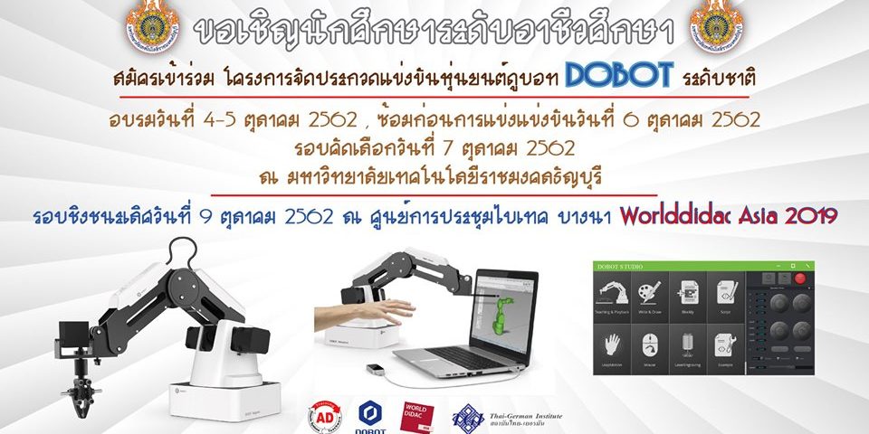 สัมภาษณ์ อ.อุดมศักดิ์ จันทรทาโพ อาจารย์ประจำสาขาวิชาวิศวกรรมแมคคาทรอนิกส์ คณะวิศวกรรมศาสตร์ มหาวิทยาลัยเทคโนโลยีราชมงคลธัญบุรี การจัดการประกวดแข่งขันหุ่นยนต์ดูบอท (DOBOT) ระดับชาติ ชิงเงินรางวัลและโล่เกียรติยศ ครั้งที่ 1 โดยความร่วมมือของคณะครุศาสตร์อุตสาหกรรม มทร.ธัญบุรี และบริษัท ออโต ไดแด็กติก จำกัด โดย 1 ทีม ประกอบด้วยอาจารย์ผู้ควบคุม จำนวน 1 ท่านและนักศึกษาระดับอาชีวศึกษา จำนวน 1 ท่าน หมดเขตรับสมัครวันที่ 30 กรกฎาคม 2562 สำหรับการแข่งขันรอบคัดเลือกจะใช้สนาม ณ มหาวิทยาลัยเทคโนโลยีราชมงคลธัญบุรี ในวันที่ 7 ตุลาคม 2562 และจะมีการแข่งขันรอบชิงชนะเลิศ ...