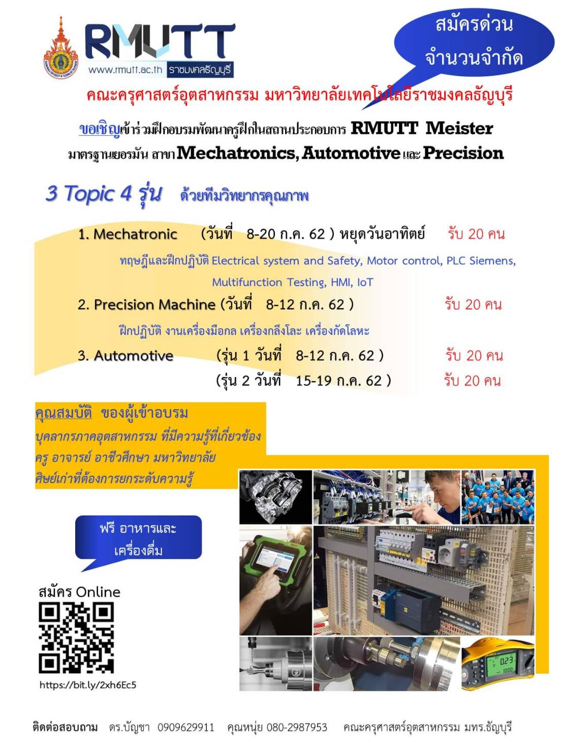 คณะครุศาสตร์อุตสาหกรรม มทร.ธัญบุรี ขอเชิญเข้าร่วมฝึกอบรมพัฒนาครูฝึกในสถานประกอบการ RMUTT Meister มาตรฐานเยอรมัน สาขา Mechatronics , Automotive และ Precision 3 Topic 4 รุ่น ด้วยทีมวิทยากรคุณภาพ รายละเอียดเพิ่มเติมโทร 090 962 9911 080 298 7953 รับฟังสัมภาษณ์ ดร.บัญชา แสนโสดา หัวหน้าภาควิชาครุศาสตร์อุตสาหกรรม มหาวิทยาลัยเทคโนโลยีราชมงคลธัญบุรี ...