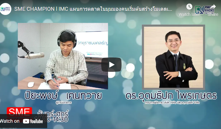 SME CHAMPION l IMC แผนการตลาดในมุมมองคนเริ่มต้นสร้างโมเดลเพื่อตอบโจทย์ธุรกิจ ติดตามข่าวสารการส่งเสริม SME กับ ดร.อุดมธิปก ไพรเกษตร กรรมการผู้จัดการ บริษัท ดิจิทัลบิสิเนส คอนซัลท์ จำกัด และปิยะพงษ์ เคนทวาย [8 เมษายน 2564] #SME_Champion, #วิทยุราชมงคลธัญบุรี, #SME, #เอสเอ็มอี, ...
