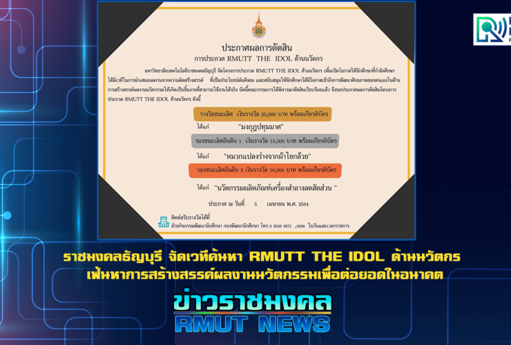 ผู้ช่วยศาสตราจารย์ ดร.สมหมาย ผิวสอาด อธิการบดีมหาวิทยาลัยเทคโนโลยีราชมงคลธัญบุรี ได้ลงนามในประกาศผลการตัดสินโครงการประกวด RMUTT THE IDOL ด้านนวัตกร โดยรางวัลชนะเลิศ ได้แก่ โครงการมงกุฎปทุมมาศ ประกอบด้วย นายณัฐภาส อยู่สว่าง นางสาวลักขณา ศรีกาญจนา และนายสุรเชษฐ์ โคตรชัย นักศึกษาจากสาขาวิชาอาหารและโภชนาการ คณะเทคโนโลยีคณะกรรมศาสตร์ ซึ่งได้รับเงินรางวัล 25,000 บาท พร้อมเกียรติบัตร. รางวัลรองชนะเลิศอันดับ 1 ได้แก่ โครงการหมวกแปลงร่างจากผ้าใยกล้วย ผลงานจาก นายธรรมนูญ กิตติรักษ์ นักศึกษาสาขาวิชาการออกแบบแฟชั่นและนวัตกรรม คณะเทคโนโลยีคหกรรมศาสตร์ ได้รับเงินรางวัล 15,000 บาท พร้อมเกียรติบัตร และรางวัลรองชนะเลิศอันดับ 2 ...