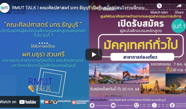 RMUT TALK I ศูนย์พัฒนาศักยภาพด้านภาษาและอุตสาหกรรมการบริการ คณะศิลปศาสตร์ มทร.ธัญบุรี เปิดรับสมัครผู้สนใจร่วมฝึกอบรมหลักสูตรมัคคุเทศก์ทั่วไป รุ่นที่ 1 สัมภาษณ์ ผศ.มธุรา สวนศรี อาจารย์ประจำสาขาการท่องเที่ยว คณะศิลปศาสตร์ มหาวิทยาลัยเทคโนโลยีราชมงคลธัญบุรี ศูนย์พัฒนาศักยภาพด้านภาษาและอุตสาหกรรมการบริการ คณะศิลปศาสตร์ (LIS Center) เปิดรับสมัครผู้สนใจเข้าร่วมฝึกอบรมหลักสูตรมัคคุเทศก์ทั่วไป รุ่นที่ 1 ตั้งแต่บัดนี้ – 20 กรกฎาคม 2564 เรียนทุกวันเสาร์ – อาทิตย์ที่ 7 สิงหาคม 2564 – 20 กุมภาพันธ์ 2565 (รับจำนวนจำกัด) สอบถามรายละเอียดเพิ่มเติม โทร. ...