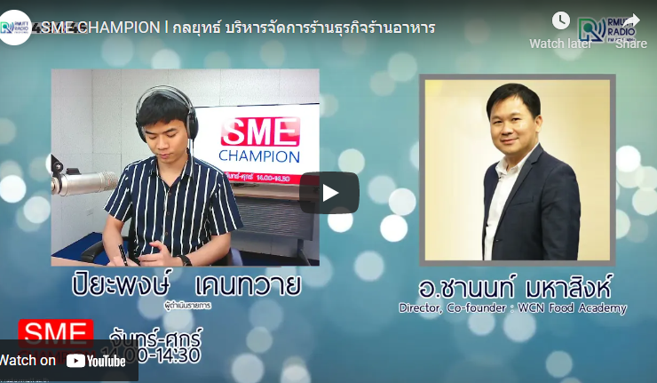 SME CHAMPION l กลยุทธ์ บริหารจัดการร้านธุรกิจร้านอาหาร ในช่วง SME TALK วันนี้คุยกับ อ.ชานนท์ มหาสิงห์ Director Co-Founder, WCN Food Academy [26 มีนาคม 2564] เวลา 14.20-14.30 น. ติดตามบทวิเคราะห์จาก อ.ชานนท์ มหาสิงห์ ได้ทุกวันศุกร์ ทางวิทยุราชมงคลธัญบุรี ดำเนินรายการโดย และปิยะพงษ์ เคนทวาย ติดตามผลงานวิจัยของ อ.ชานนท์ เรื่อง “ปัจจัยความสำเร็จของผู้ประกอบการร้านอาหารขนาดกลางที่มีสาขาเครือข่ายในกรุงเทพมหานครและปริมณฑล” ได้ที่ https://so02.tci-thaijo.org/index.php/ibas/article/view/244643/166762 SME_Champion, วิทยุราชมงคลธัญบุรี, SME, เอสเอ็มอี, ...