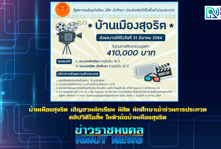 องค์การนักศึกษา มหาวิทยาลัยเทคโนโลยีราชมงคลธัญบุรี ประชาสัมพันธ์ว่า แฟนเพจเฟซบุ๊ค บ้านเมืองสุจริต เชิญชวน นักเรียน นิสิต นักศึกษา เข้าร่วมการประกวดคลิปวิดีโอสั้น ในหัวข้อ บ้านเมืองสุจริตชิงทุนการศึกษารวมมูลค่า 410,000บาท โดยคุณสมบัติผู้สมัคร มี 2 ประเภท คือ 1.นักเรียน อายุไม่เกิน 18 ปี 2.นิสิต นักศึกษา อายุไม่เกิน 25 ปี . กติกาการส่งผลงานเข้าประกวด เป็นคลิปวิดีโอ มีแนวคิด มุ่งสร้าง บ้านเมืองสุจริต ความยาวคลิปต้องไม่เกิน 3 นาที และต้องไม่น้อยกว่า 2 นาที ส่งรายละเอียดผลงานโดยกำหนดชื่อเรื่อง ...