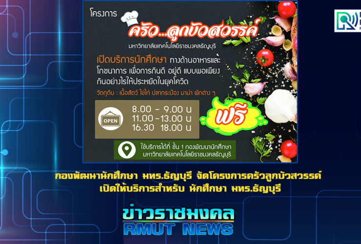 กองพัฒนานักศึกษา มหาวิทยาลัยเทคโนโลยีราชมงคลธัญบุรีหรือมทร.ธัญบุรี จัดทำโครงการ ครัวลูกบัวสวรรค์ เปิดให้บริการสำหรับ นักศึกษา มทร.ธัญบุรี ที่สนใจทางด้านการทำอาหาร และโภชนาการ เพื่อเป็นไปตามแนวคิด การกินแบบพอเพียง กินอย่างไรให้ประหยัดในยุคโควิด-19 โดยกองพัฒนานักศึกษามีวัตถุดิบให้พร้อม อาทิ เนื้อหมู เนื้อไก่ ผักสด มาม่า เครื่องปรุง พร้อมบริการให้กับนักศึกษาที่สนใจ นอกจากนี้ การใช้บริการไม่มีค่าใช้จ่ายใดใดทั้งสิ้น เปิดให้บริการ ทั้งหมด 3 ช่วงเวลา ได้แก่ เวลา 08.00-09.00 น. 11.00-13.00 น. และ 16.30-18.00 น. สามารถใช้บริการได้ที่ ชั้น 1 กองพัฒนานักศึกษา มหาวิทยาลัยเทคโนโลยีราชมงคลธัญบุรี ...