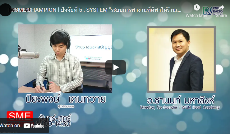 SME CHAMPION l ปัจจัยที่ 5 : SYSTEM “ระบบการทำงานที่ดีทำให้ร้านเติบโต” ในช่วง SME TALK วันนี้คุยกับ อ.ชานนท์ มหาสิงห์ Director Co-Founder, WCN Food Academy [19 มีนาคม 2564] เวลา 14.20-14.30 น. ติดตามบทวิเคราะห์จาก อ.ชานนท์ มหาสิงห์ ได้ทุกวันศุกร์ ทางวิทยุราชมงคลธัญบุรี ดำเนินรายการโดย และปิยะพงษ์ เคนทวาย ติดตามผลงานวิจัยของ อ.ชานนท์ เรื่อง “ปัจจัยความสำเร็จของผู้ประกอบการร้านอาหารขนาดกลางที่มีสาขาเครือข่ายในกรุงเทพมหานครและปริมณฑล” ได้ที่ https://so02.tci-thaijo.org/index.php/ibas/article/view/244643/166762 SME_Champion, ...