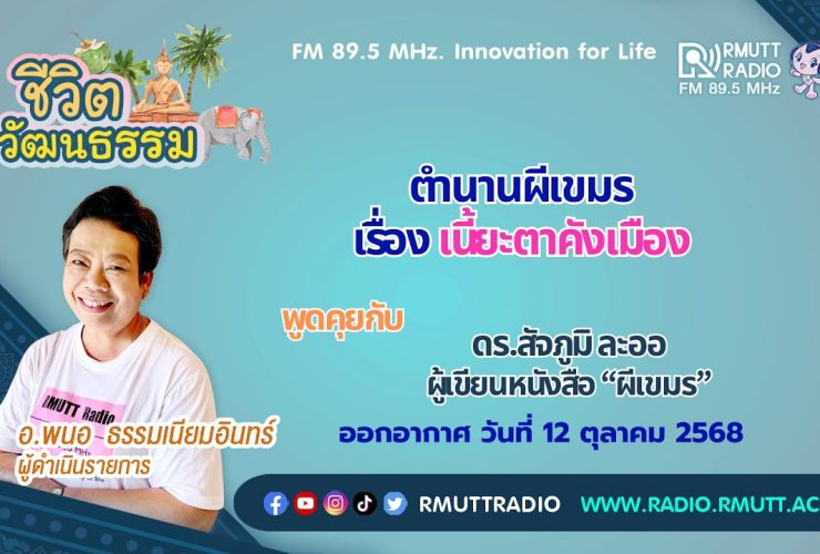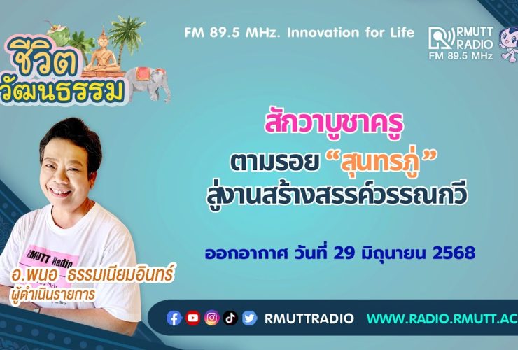 ชีวิตวัฒนธรรม – เสียงในภาษาและดนตรีที่มาจากความเป็นคนเจ้าบทเจ้ากลอน . ชีวิตวัฒนธรรมสัปดาห์นี้ขอพาคุณผู้ฟังไปพูดคุยกับ ผศ.พิศศรี กมลเวชช ผู้เชี่ยวชาญด้านภาษาไทย ถึงเรื่องราวของคำร้องในเพลงไทยน่าสนใจ ชวนวิเคราะห์ทั้งความหมาย เสียงในภาษาและดนตรีที่มาจากความเป็นคนเจ้าบทเจ้ากลอนของคนไทยผู้รังสรรค์ และการสืบทอดภาษาทั้งเสียงและตัวอักษรอาจมีข้อผิดเพี้ยนได้ ด้วยเหตุใด ผู้สืบสานพึงไตร่ครองเพื่อใช้ให้งดงาม สมบูรณ์ . ติดตามได้ในชีวิตวัฒนธรรมกับ อาจารย์พนอ ธรรมเนียมอินทร์ ทางวิทยุราชมงคลธัญบุรี FM 89.5 MHz ออกอากาศวันที่ 7 ธันวาคม 2568 ...