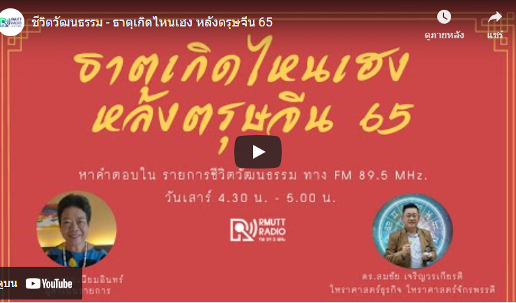 ชีวิตวัฒนธรรม – ธาตุเกิดไหนเฮง หลังตรุษจีน 65 มาหาคำตอบกัน ว่า ธาตุเกิดไหนเฮง หลังตรุษจีน 65 กับ ดร.สมชัย เจริญวรเกียรติ โหราศาสตร์ธุรกิจ โหราศาสตร์จักรพรรดิ และ อาจารย์พนอ ธรรมเนียมอินทร์ ผู้ดำเนินรายการชีวิตวัฒนธรรม ทุกวันเสาร์ 4.30 – 5.00 น. ทาง FM 89.5 MHz รายละเอียดเพิ่มเติมติดตามได้ที่ Page Facebook :: RMUTTRadio ...