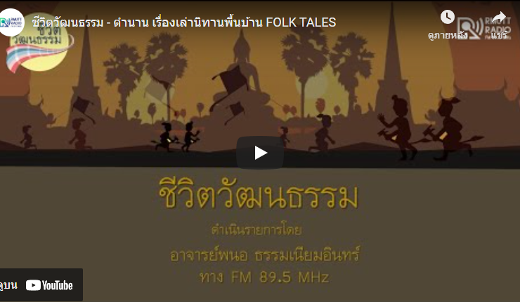 ชีวิตวัฒนธรรม – ตำนาน เรื่องเล่านิทานพื้นบ้าน FOLK TALES . นิทานชาวบ้าน นิทานพื้นบ้าน (folktale) เป็นนิทานประเภทหนึ่ง เป็นเรื่องราวที่เล่าสืบต่อกันมาซึ่งอาจไม่มีบันทึกเป็นหลักฐาน เนื่องจากสมัยโบราณไม่มีความบันเทิงในรูปแบบอื่นในสังคมหลายวัฒนธรรมใช้การเล่าเรื่องสู่กันฟังซึ่งมักเป็นเรื่องราวจากจินตนาการแสดงความเชื่อของชาวบ้าน นิทานพื้นบ้านมักได้รับการบันทึกหรือตีพิมพ์ภายหลังและมักหาต้นกำเนิด . หาความรู้กับ อาจารย์พนอ ธรรมเนียมอินทร์ ผู้ดำเนินรายการชีวิตวัฒนธรรม ทุกวันเสาร์ 4.30 – 5.00 น. ทาง FM 89.5 MHz ...