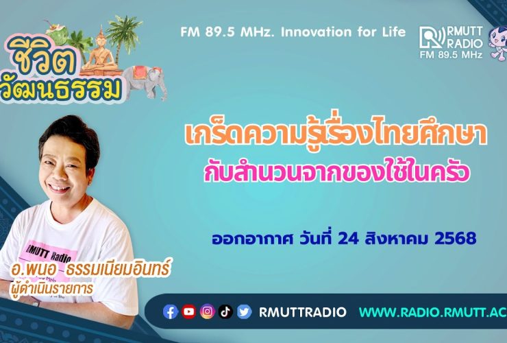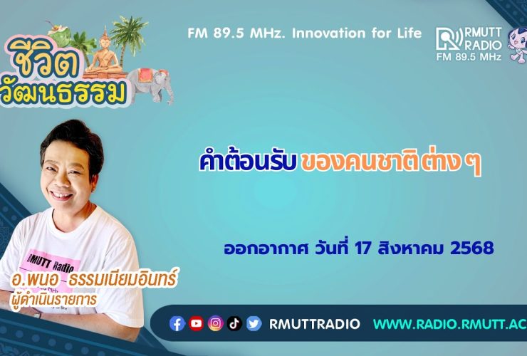 ชีวิตวัฒนธรรม – คำเรียกขาน ที่มีมาตั้งแต่โบราณ จนถึงทุกวันนี้ ชีวิตวัฒนธรรมสัปดาห์นี้ขอนำเสนอเรื่องราวของคำเรียกขาน ที่ใชกันมาตั้งแต่โบราณจวบจนถึงทุกวันนี้ พร้อมกับเรื่องราวของลูกตาล ว่ามีคำเรียกอะไรกันบ้าง ติดตามได้ในชีวิตวัฒนธรรมกับ อาจารย์พนอ ธรรมเนียมอินทร์ ทางวิทยุราชมงคลธัญบุรี FM 89.5 MHz ...