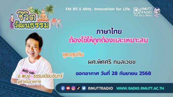 ชีวิตวัฒนธรรม – ภาษาไทย ต้องใช้ให้ถูกต้องและเหมาะสม ชีวิตวัฒนธรรมสัปดาห์นี้ขอพาคุณผู้ฟังไปพูดคุยกับผศ.พิศศรี กมลเวชช ถึงเรื่องราวของภาษาไทย ต้องใช้ให้ถูกต้องและเหมาะสม ...