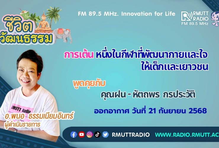 ชีวิตวัฒนธรรม – การเต้น หนึ่งในกีฬาที่พัฒนากายและใจให้เด็กและเยาวชน ชีวิตวัฒนธรรมสัปดาห์นี้ขอพาคุณผู้ฟังไปพูดคุยกับคุณฝน – หัตถพร กรประวัติ ถึงเรื่องราวของชีวิตการเต้น หนึ่งในกีฬาที่พัฒนากายและใจให้เด็กและเยาวชน ...