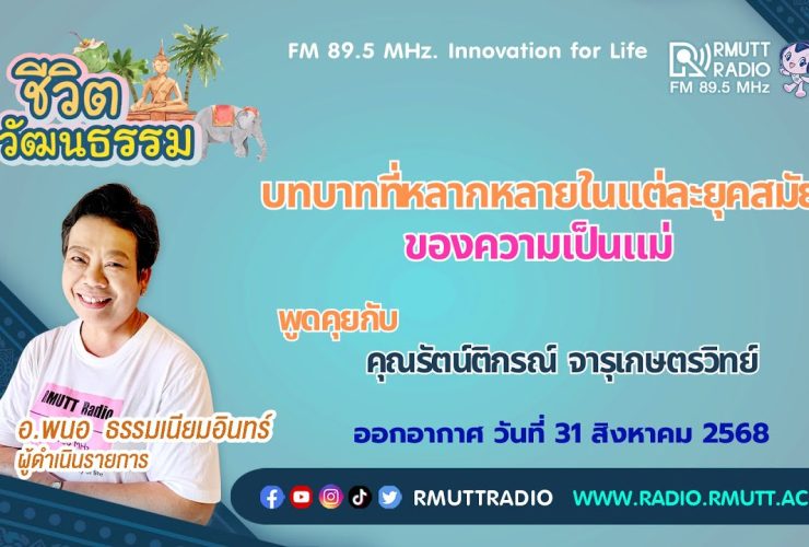 ชีวิตวัฒนธรรม – บทบาทที่หลากหลายในแต่ละยุคสมัย ของความเป็นแม่ ชีวิตวัฒนธรรมสัปดาห์นี้ขอพาคุณผู้ฟังไปพูดคุยถึงเรื่องราวของบทบาทที่หลากหลายในแต่ละยุคสมัย ของความเป็นแม่ กับคุณรัตน์ติกรณ์ จารุเกษตรวิทย์ ...