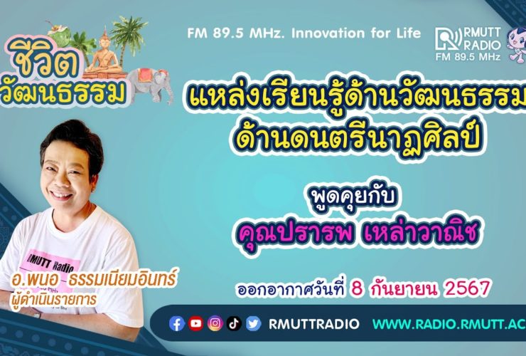 ชีวิตวัฒนธรรม – แหล่งเรียนรู้ด้านวัฒนธรรมด้านดนตรีนาฏศิลป์ ชีวิตวัฒนธรรมสัปดาห์นี้ขอเสนอเรื่องราวของ คุณปรารพ เหล่าวาณิช ผู้ร่วมก่อตั้งแหล่งเรียนรู้ด้านวัฒนธรรมด้านดนตรีนาฏศิลป์ที่ร่วมอนุรักษ์ สืบสาน ต่อยอดจนมีผลงานปรากฏทั้งในประเทศและต่างประเทศ ติดตามได้ในชีวิตวัฒนธรรมกับ อาจารย์พนอ ธรรมเนียมอินทร์ ทางวิทยุราชมงคลธัญบุรี FM 89.5 MHz ...