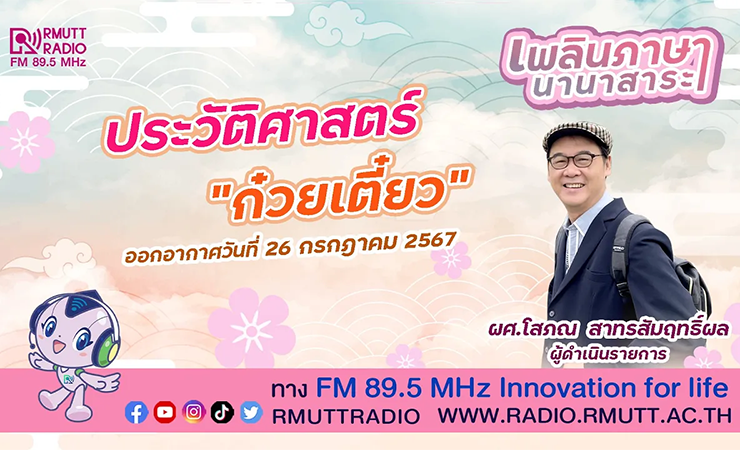 เพลินภาษานานาสาระ l ประวัติศาสตร์ “ก๋วยเตี๋ยว” ในประเทศไทย คำว่า “ก๋วยเตี๋ยว” อาจจะมาจากภาษาจีนฮกเกี้ยนหรือภาษาจีนแต้จิ๋ว โดยแต้จิ๋วอ่าน “ก๋วยเตี๊ยว” ฮกเกี้ยนอ่าน “ก๊วยเตี๋ยว” ส่วนในจีนกลางจะอ่านว่า “กั่วเถียว” (guǒtiáo) แปลว่า เส้นข้าวสุก เป็นคนละคำกับ 粉条/粉條 (fěntiáo) ที่หมายถึงวุ้นเส้น หรือ 面条/麵條 (miàntiáo) ที่หมายถึงบะหมี่ สันนิษฐานกันว่าก๋วยเตี๋ยวในประเทศไทยมีมาเมื่อประมาณสมัยสมเด็จพระนารายณ์มหาราช ซึ่งเป็นช่วงที่ไทยมีการติดต่อกับชาวต่างชาติมากมาย ว่ากันว่าเป็นยุครุ่งเรืองของอาหาร เริ่มมีการดัดแปลงอาหารต่างชาติ ให้เข้ากับวัตถุดิบและรสชาติที่ถูกปากชาวอยุธยา เช่น ขนมทองหยิบ ทองหยอด จากโปรตุเกส หรือพวกแกงกะทิที่ได้รับอิทธิพลจากเปอร์เซีย คาดว่าชาวจีนก็ได้นำเอาก๋วยเตี๋ยวเข้ามากินกันในเรือ และเป็นสิ่งแปลกใหม่สำหรับคนไทย ดำเนินรายการโดย ผู้ช่วยศาสตราจารย์โสภณ สาทรสัมฤทธิ์ผล ...
