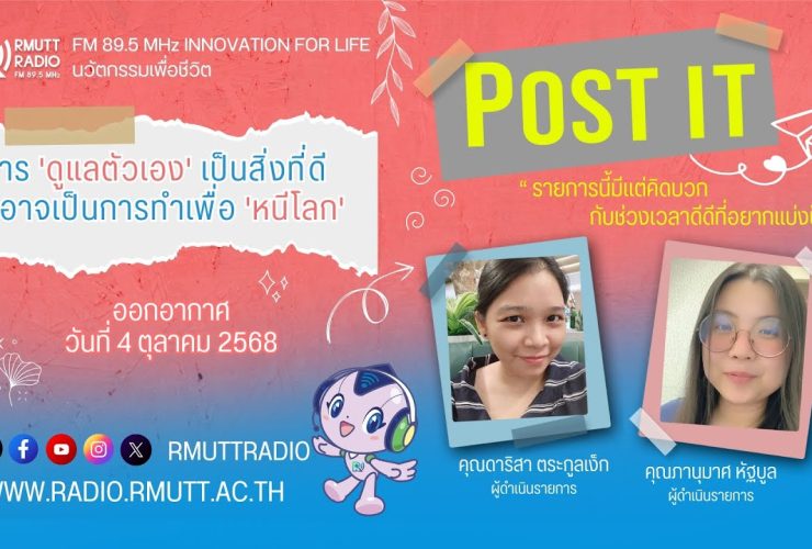 POST IT I ‘โรคมโน’ ไม่ใช่แค่นิสัย แต่เป็นปัญหาสุขภาพจิตที่ต้องรักษา หลายครั้งที่เราอาจเคยใช้คำว่า “มโน” ในความหมายทั่วไปที่แปลว่า การคิดไปเอง แต่ในทางจิตวิทยา เมื่อพฤติกรรมการจินตนาการและการพูดไม่จริงนั้นเกิดขึ้นอย่างต่อเนื่องจนควบคุมไม่ได้ และดูเหมือนไม่มีเหตุผลชัดเจน I ที่มาของบทความ :: www.bangkokbiznews.com ดำเนินรายการโดย ดาริสา ตระกูลเง็ก และ ภานุมาศ หัฐบูล รับฟังได้ทาง FM 89.5 MHz. Innovation for Life วิทยุราชมงคลธัญบุรี วันเสาร์ที่ 6 ธันวาคม 2568 ...