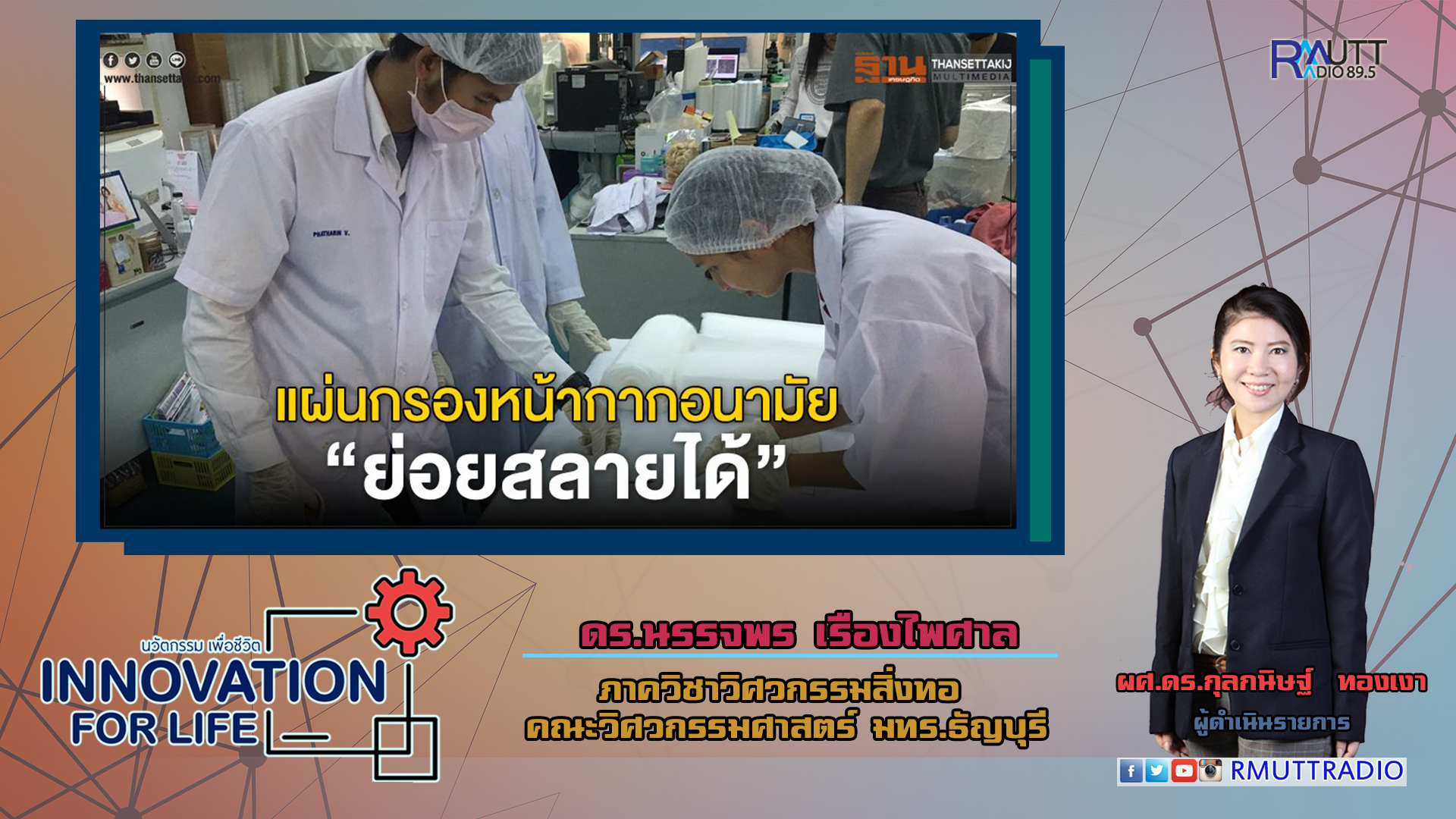 https://www.facebook.com/173993725962646/videos/2605067579752389/ Innovationforlife l มทร.ธัญบุรี ร่วมกับ Kyoto institute of technology วิจัยและผลิตแผ่นกรองหน้ากากอนามัย ‘ย่อยสลายได้ . ดร.นรรจพร เรืองไพศาล อาจารย์ประจำภาควิชาวิศวกรรมสิ่งทอ คณะวิศวกรรมศาสตร์ มทร.ธัญบุรี . ปริมาณขยะที่เกิดขึ้นจากขยะหน้ากากอนามัยเพิ่มขึ้นเป็นทวีคูณ เพื่อลดปริมาณขยะดังกล่าว ทางคณะผู้วิจัยอาจารย์และนักศึกษาระดับปริญญาเอก คณะวิศวกรรมศาสตร์ ซึ่งเป็นโครงการพัฒนานักวิจัยและงานวิจัยเพื่ออุตสาหกรรม (พวอ.) ได้รับทุนสนับสนุนจาก สกว. คิดค้น แผ่นกรองชนิดเปลี่ยนได้และสามารถย่อยสลายได้ ใช้คู่กับหน้ากากอนามัยชนิดที่สามารถเปลี่ยนชั้นกรองและซักได้หลายครั้ง . ออกอากาศ[10 พฤษภาคม 2563 ] ...