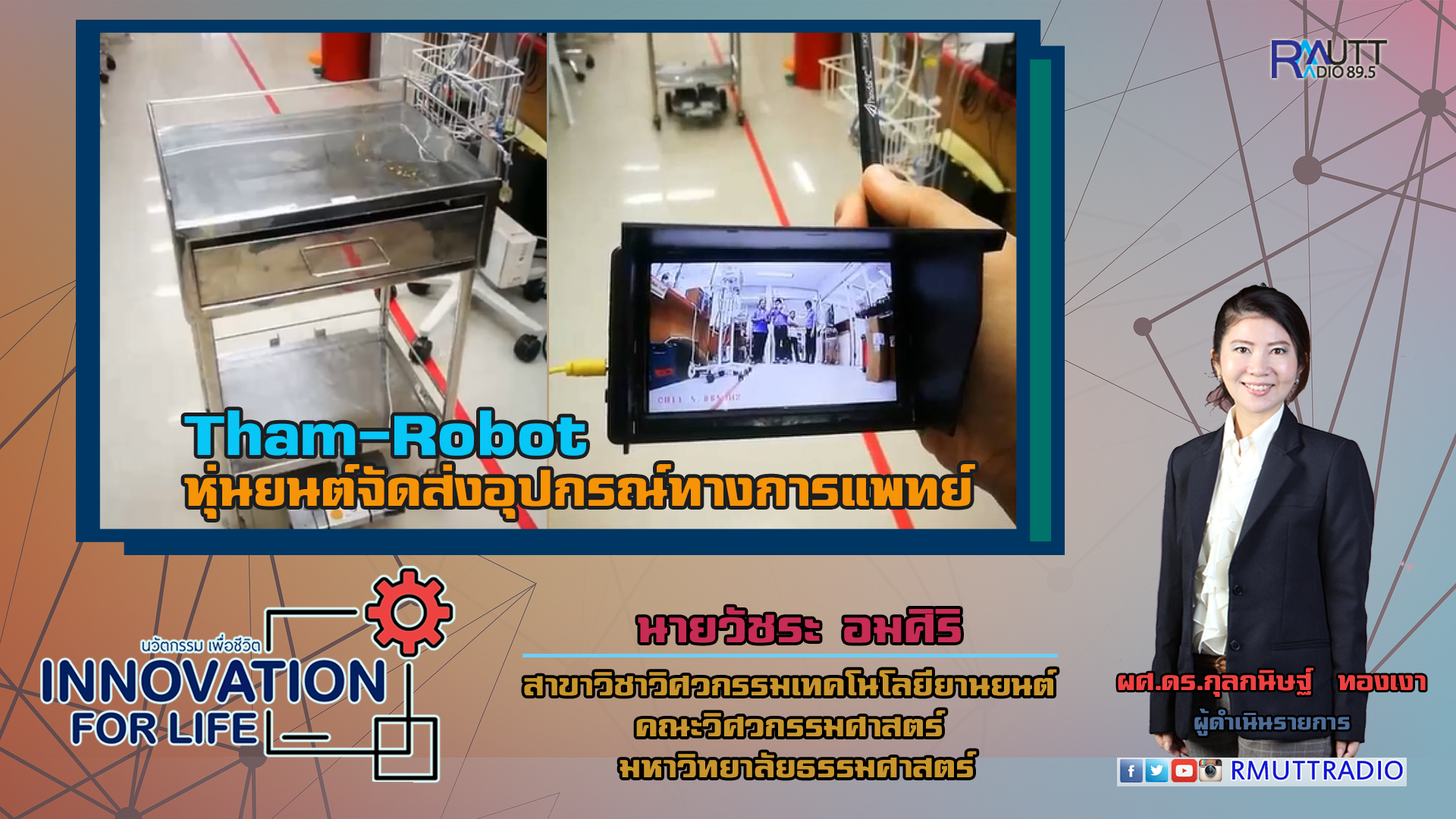 https://www.facebook.com/173993725962646/videos/1251818158353719/ Innovationforlife l “Tham-Robot” หุ่นยนต์จัดส่งอุปกรณ์ทางการแพทย์ ช่วยคุณหมอ ประจำการ รพ.สนามธรรมศาสตร์ . นายวัชระ อมศิริ อาจารย์ประจำสาขาวิชาวิศวกรรมเทคโนโลยียานยนต์ คณะวิศวกรรมศาสตร์ มหาวิทยาลัยธรรมศาสตร์ . นักวิชาการ นักศึกษาคณะวิศวกรรมศาสตร์ มหาวิทยาลัยธรรมศาสตร์ และบุคลากรทางการแพทย์โรงพยาบาลธรรมศาสตร์เฉลิมพระเกียรติ ร่วมกันพัฒนา “Tham-Robot : หุ่นยนต์จัดส่งอุปกรณ์ทางการแพทย์” รถเข็นอัจฉริยะเพื่อการจัดส่งยาและอุปกรณ์ทางการแพทย์ตัวแรก ที่จำเป็นต่อการรักษาถึงมือผู้ป่วยในโรงพยาบาลสนาม เพื่อเป็นส่วนหนึ่งในการแบ่งเบาภาระความเสี่ยงของบุคลากรทางการแพทย์ หรือเว้นระยะห่างทางสังคม . ออกอากาศ[17 พฤษภาคม 2563 ] ติดตามรับฟังได้ทาง#วิทยุราชมงคล #วิจัยนวัตกรรม #ราชมงคล #ThamRobot #FM895 ...