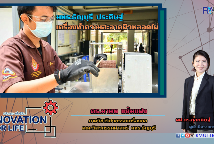 https://www.facebook.com/RMUTTRadio/videos/262138618232701/?v=262138618232701 #Innovationforlife l น.ศ.-นักวิจัย มทร.ธัญบุรี คิดค้นและประดิษฐ์เครื่องทำความสะอาดผิวหลอดไผ่ . ดร.มานพ แย้มแฟง นักวิจัย และอาจารย์ประจำภาควิชาวิศวกรรมเครื่องกล คณะวิศวกรรมศาสตร์ มทร.ธัญบุรี . อาจารย์และนักศึกษามหาวิทยาลัยเทคโนโลยีราชมงคล (มทร.) ธัญบุรี ออกแบบและสร้างเครื่องทำความสะอาดหลอดไผ่ ทำความสะอาดผิวหลอดไผ่ได้ 88 หลอดต่อชั่วโมง ทดแทนการใช้แรงงานคน . ออกอากาศ[ 7 มิถุนายน 2563 ] ติดตามรับฟังได้ทาง#วิทยุราชมงคล #วิจัยนวัตกรรม #ราชมงคล #เครื่องทำความสะอาดผิวหลอดไผ่ #FM895 ...