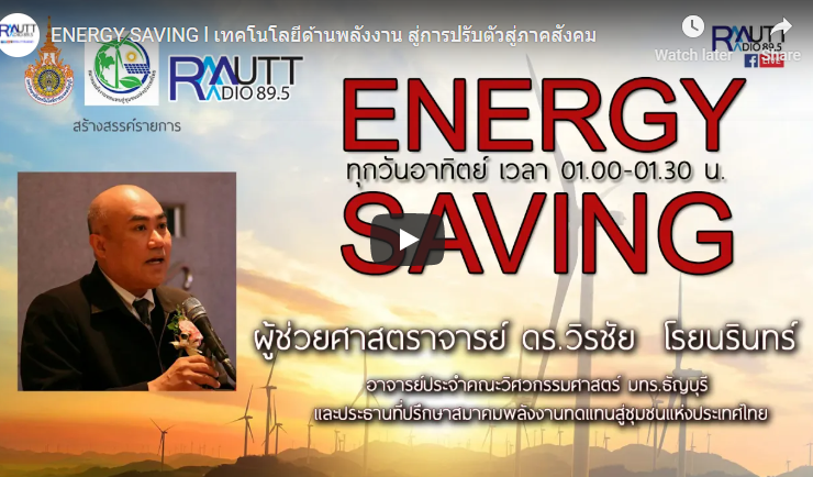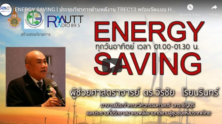 ENERGY SAVING l ประชุมวิชาการด้านพลังาน TREC13 พร้อมจัดแบบ Hybrid สร้างโอกาสการเข้าถึงองค์ความรู้ ดำเนินรายการโดย ปิยะพงษ์ เคนทวาย และผู้ช่วยศาสตราจารย์ ดร.วิรชัย โรยนรินทร์ อาจารย์ประจำมหาวิทยาลัยเทคโนโลยีราชมงคลธัญบุรีและประธานที่ปรึกษาสมาคมพลังงานทดแทนสู่ชุมชนแห่งประเทศไทย (ออกอากาศวันอาทิตย์ที่ 30 สิงหาคม 2563)ทางสถานีวิทยุกระจายเสียงมหาวิทยาลัยเทคโนโลยีราชมงคลธัญบุรี FM 89.5 Mhz ...