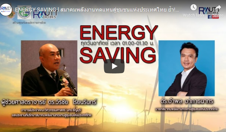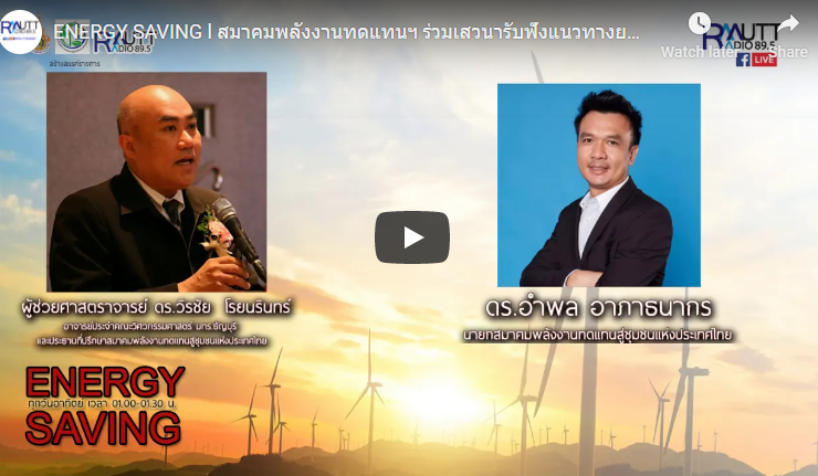 ENERGY SAVING l สมาคมพลังงานทดแทนฯ ร่วมเสวนารับฟังแนวทางยกระดับศักยภาพชุมชนท้องถิ่น แขกรับเชิญในสัปดาห์นี้ ได้รับเกียรติกจาก “ดร.อำพล อาภาธนากร” นายกสมาคมพลังงานทดแทนสู่ชุมชนแห่งประเทศไทย ดำเนินรายการโดย ปิยะพงษ์ เคนทวาย และผู้ช่วยศาสตราจารย์ ดร.วิรชัย โรยนรินทร์ อาจารย์ประจำมหาวิทยาลัยเทคโนโลยีราชมงคลธัญบุรีและประธานที่ปรึกษาสมาคมพลังงานทดแทนสู่ชุมชนแห่งประเทศไทย (ออกอากาศวันอาทิตย์ที่ 13 ธันวาคม 2563)ทางสถานีวิทยุกระจายเสียงมหาวิทยาลัยเทคโนโลยีราชมงคลธัญบุรี FM 89.5 Mhz ...