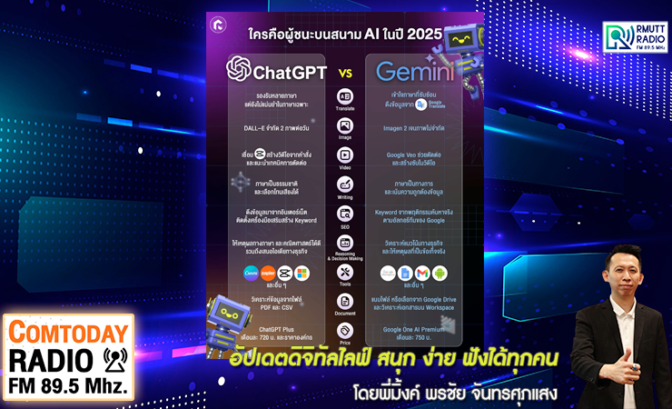 Comtoday l ChatGPT vs Gemini ใครคือผู้ชนะบนสนาม AI ในปี 2025 . ดำเนินรายการโดย พี่มิ้งค์ พรชัย จันทรศุภแสง . ออกอากาศ 12 กันยายน 2568 ติดตามรับฟังได้ทาง #วิทยุราชมงคลธัญบุรี #RmuttRadio #Comtoday #computer #เทคโนโลยี ...