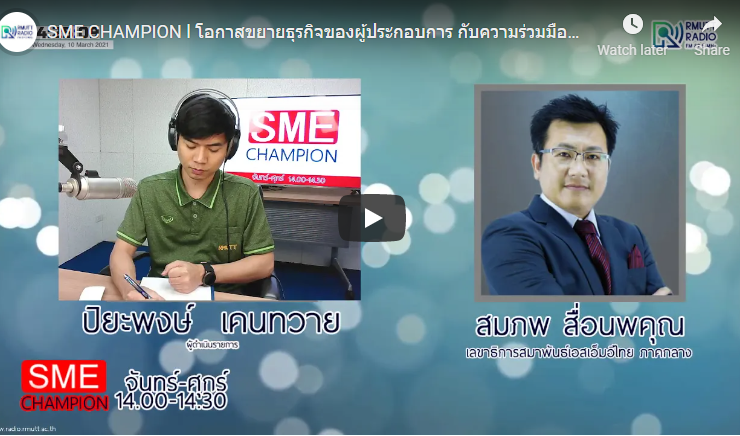 SME CHAMPION l โอกาสขยายธุรกิจของผู้ประกอบการ กับความร่วมมือการค้าไทย-จีน ตามนโยบาย 1 แถบ 1 เส้นทาง ในช่วง SME TALK วันนี้คุยกับ คุณสมภพ สื่อนพคุณ (เลขาธิการสมาพันธ์เอสเอ็มอีไทย ภาคกลาง) [10 มีนาคม 2564] ติดตามข่าวสารการสัมภาษณ์จากสมาพันธ์เอสเอ็มอีไทย ทางวิทยุราชมงคลธัญบุรี เวลา 14.20-14.30 น. ทุกวันพุธ ดำเนินรายการโดย ปิยะพงษ์ เคนทวาย ...