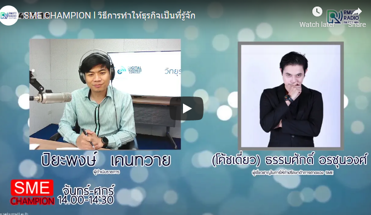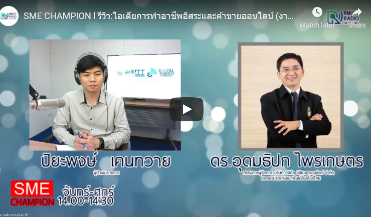 SME CHAMPION l รีวิว:ไอเดียการทำอาชีพอิสระและค้าขายออนไลน์ (งานปัจฉิมนิเทศ ศิลปศาสตร์ มทร.ธัญบุรี) ติดตามข่าวสารการส่งเสริม SME กับ ดร.อุดมธิปก ไพรเกษตร กรรมการผู้จัดการ บริษัท ดิจิทัลบิสิเนส คอนซัลท์ จำกัด และปิยะพงษ์ เคนทวาย [12 มีนาคม 2564] #SME_Champion, #วิทยุราชมงคลธัญบุรี, #SME, #เอสเอ็มอี, ...