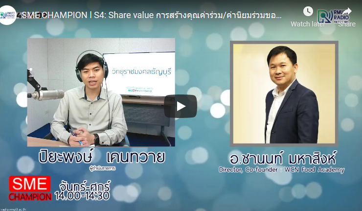 SME CHAMPION l S4: Share value การสร้างคุณค่าร่วม/ค่านิยมร่วมขององค์กร ในธุรกิจร้านอาหาร ในช่วง SME TALK วันนี้คุยกับ อ.ชานนท์ มหาสิงห์ Director Co-Founder, WCN Food Academy [12 มีนาคม 2564] เวลา 14.20-14.30 น. ติดตามบทวิเคราะห์จาก อ.ชานนท์ มหาสิงห์ ได้ทุกวันศุกร์ ทางวิทยุราชมงคลธัญบุรี ดำเนินรายการโดย และปิยะพงษ์ เคนทวาย ติดตามผลงานวิจัยของ อ.ชานนท์ เรื่อง “ปัจจัยความสำเร็จของผู้ประกอบการร้านอาหารขนาดกลางที่มีสาขาเครือข่ายในกรุงเทพมหานครและปริมณฑล” ได้ที่ https://so02.tci-thaijo.org/index.php/ibas/article/view/244643/166762 SME_Champion, ...