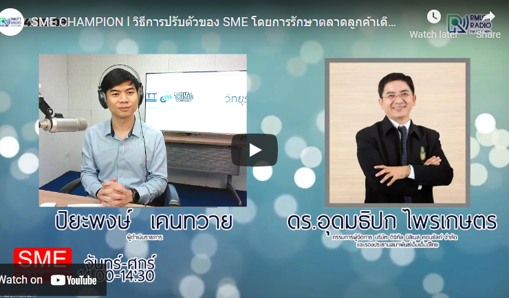 SME CHAMPION l วิธีการปรับตัวของ SME โดยการรักษาตลาดลูกค้าเดิมเสริมลูกค้าใหม่ แก้ปัญหาช่วง COVID-19 ติดตามข่าวสารการส่งเสริม SME กับ ดร.อุดมธิปก ไพรเกษตร กรรมการผู้จัดการ บริษัท ดิจิทัลบิสิเนส คอนซัลท์ จำกัด และปิยะพงษ์ เคนทวาย [17 มีนาคม 2564] #SME_Champion, #วิทยุราชมงคลธัญบุรี, #SME, #เอสเอ็มอี, ...