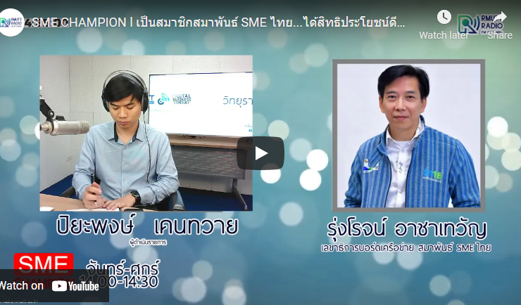 SME CHAMPION l เป็นสมาชิกสมาพันธ์ SME ไทย…ได้สิทธิประโยชน์ดีดีอย่างไร? ในช่วง SME TALK วันนี้คุยกับ คุณรุ่งโรจน์ อาชาเทวัญ (เลขาธิการบอร์ดเครือข่าย สมาพันธ์เอสเอ็มอีไทย) [17 มีนาคม 2564] ติดตามข่าวสารการสัมภาษณ์จากสมาพันธ์เอสเอ็มอีไทย ทางวิทยุราชมงคลธัญบุรี เวลา 14.20-14.30 น. ทุกวันพุธ ดำเนินรายการโดย ปิยะพงษ์ เคนทวาย ...