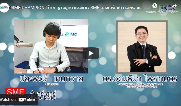 SME CHAMPION l รักษาฐานลูกค้าเดิมแล้ว SME ต้องเตรียมความพร้อมเพื่อหาลูกค้าใหม่ (ช่วงวิกฤต COVID-19) ติดตามข่าวสารการส่งเสริม SME กับ ดร.อุดมธิปก ไพรเกษตร กรรมการผู้จัดการ บริษัท ดิจิทัลบิสิเนส คอนซัลท์ จำกัด และปิยะพงษ์ เคนทวาย [18 มีนาคม 2564] #SME_Champion, #วิทยุราชมงคลธัญบุรี, #SME, #เอสเอ็มอี, ...
