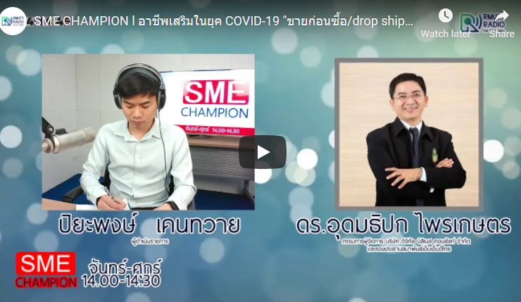 SME CHAMPION l อาชีพเสริมในยุค COVID-19 “ขายก่อนซื้อ/drop ship/Pre-order” ทางเลือกใหม่ของการเร่ิมต้น ติดตามข่าวสารการส่งเสริม SME กับ ดร.อุดมธิปก ไพรเกษตร กรรมการผู้จัดการ บริษัท ดิจิทัลบิสิเนส คอนซัลท์ จำกัด และปิยะพงษ์ เคนทวาย [26 มกราคม 2564] ...