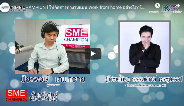 SME CHAMPION l โฟกัสการทำงานแบบ Work from home อย่างไร? ให้มีประสิทธิภาพ ช่วง SME TALK พูดคุยกับ โค้ชเดี่ยว คุณธรรมศักดิ์ อรชุนวงศ์ (ผู้เชี่ยวชาญในการให้คำปรึกษาด้านการตลาดและการสร้างแบนด์) ติดตามข่าวสารการส่งเสริม SME กับ ดร.อุดมธิปก ไพรเกษตร กรรมการผู้จัดการ บริษัท ดิจิทัลบิสิเนส คอนซัลท์ จำกัด และปิยะพงษ์ เคนทวาย . [26 มกราคม 2564] #SME_Champion, #วิทยุราชมงคลธัญบุรี, #SME, #เอสเอ็มอี, ...