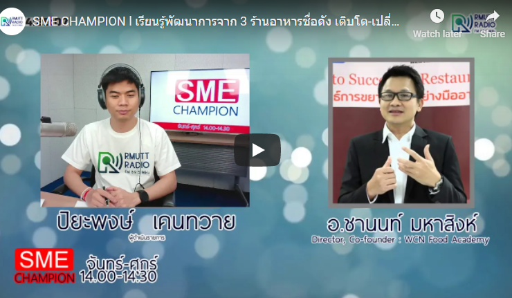SME CHAMPION l เรียนรู้พัฒนาการจาก 3 ร้านอาหารชื่อดัง เติบโต-เปลี่ยนแปลงให้เข้ากับยุคสมัยและตลาด? ในช่วง SME TALK วันนี้คุยกับ อ.ชานนท์ มหาสิงห์ Director Co-Founder, WCN Food Academy [22 มกราคม 2564] เวลา 14.20-14.30 น. ติดตามบทวิเคราะห์จาก อ.ชานนท์ มหาสิงห์ ได้ทุกวันศุกร์ ทางวิทยุราชมงคลธัญบุรี ดำเนินรายการโดย และปิยะพงษ์ เคนทวาย ...