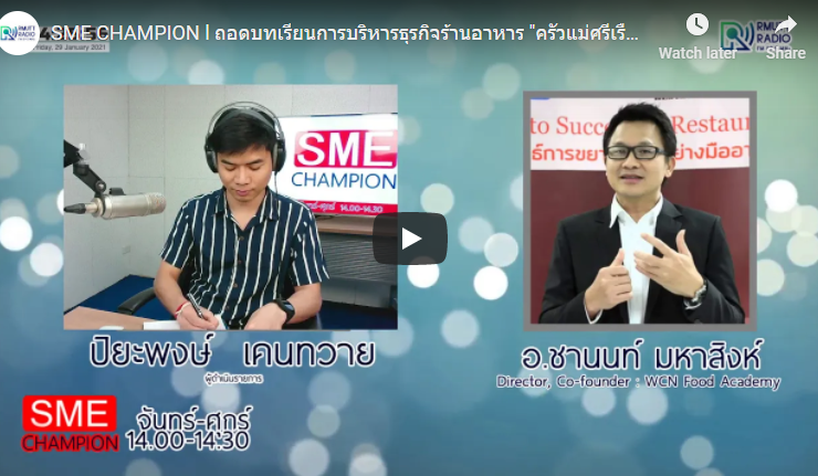 SME CHAMPION l ถอดบทเรียนการบริหารธุรกิจร้านอาหาร “ครัวแม่ศรีเรือน” เติบโตด้วยมาตรฐานและบริหารจัดการ ในช่วง SME TALK วันนี้คุยกับ อ.ชานนท์ มหาสิงห์ Director Co-Founder, WCN Food Academy [29 มกราคม 2564] เวลา 14.20-14.30 น. ติดตามบทวิเคราะห์จาก อ.ชานนท์ มหาสิงห์ ได้ทุกวันศุกร์ ทางวิทยุราชมงคลธัญบุรี ดำเนินรายการโดย และปิยะพงษ์ เคนทวาย ติดตามผลงานวิจัยของ อ.ชานนท์ เรื่อง “ปัจจัยความสำเร็จของผู้ประกอบการร้านอาหารขนาดกลางที่มีสาขาเครือข่ายในกรุงเทพมหานครและปริมณฑล” ได้ที่ https://so02.tci-thaijo.org/index.php/ibas/article/view/244643/166762 ...