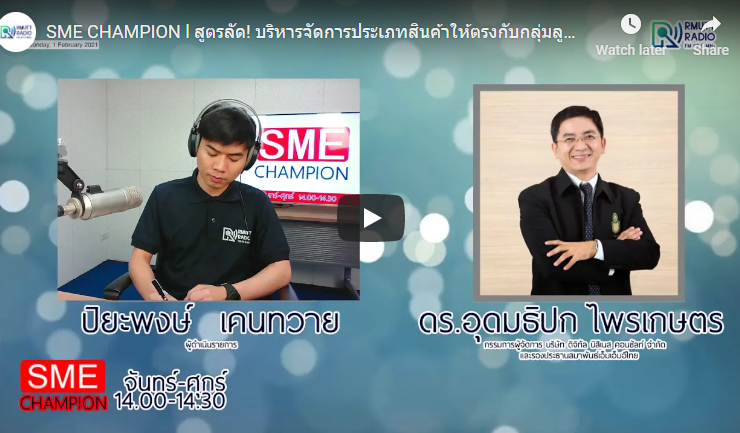 SME CHAMPION l สูตรลัด! บริหารจัดการประเภทสินค้าให้ตรงกับกลุ่มลูกค้าที่แตกต่างกัน ติดตามข่าวสารการส่งเสริม SME กับ ดร.อุดมธิปก ไพรเกษตร กรรมการผู้จัดการ บริษัท ดิจิทัลบิสิเนส คอนซัลท์ จำกัด และปิยะพงษ์ เคนทวาย [1 กุมภาพันธ์ 2564] #SME_Champion, #วิทยุราชมงคลธัญบุรี, #SME, #เอสเอ็มอี, ...