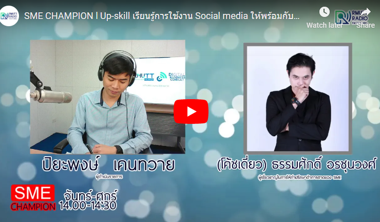 SME CHAMPION l Up-skill เรียนรู้การใช้งาน Social media ให้พร้อมกับธุรกิจ ช่วง SME TALK พูดคุยกับ โค้ชเดี่ยว คุณธรรมศักดิ์ อรชุนวงศ์ (ผู้เชี่ยวชาญในการให้คำปรึกษาด้านการตลาดและการสร้างแบนด์) ติดตามข่าวสารการส่งเสริม SME กับ ดร.อุดมธิปก ไพรเกษตร กรรมการผู้จัดการ บริษัท ดิจิทัลบิสิเนส คอนซัลท์ จำกัด และปิยะพงษ์ เคนทวาย . [2 กุมภาพันธ์ 2564] #SME_Champion, #วิทยุราชมงคลธัญบุรี, #SME, #เอสเอ็มอี, ...