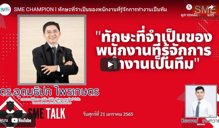 SME CHAMPION l ทักษะที่จำเป็นของพนักงานที่รู้จักการทำงานเป็นทีม ติดตามข่าวสารการส่งเสริม SME กับ ดร.อุดมธิปก ไพรเกษตร กรรมการผู้จัดการ บริษัท ดิจิทัลบิสิเนส คอนซัลท์ จำกัด และเลขาธิการสมาพันธ์เอสเอ็มอีไทย ดำเนินรายการโดย ปิยะพงษ์ เคนทวาย [21 มกราคม 2565] #SME_Champion, #วิทยุราชมงคลธัญบุรี, #SME, #เอสเอ็มอี, ...
