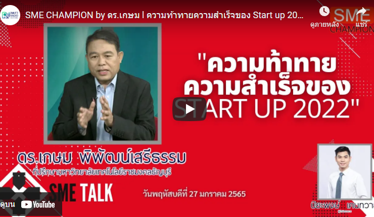 SME CHAMPION by ดร.เกษม l ความท้าทายความสำเร็จของ Start up 2022 ในช่วง SME TALK โดย ดร.เกษม พิพัฒน์เสรีธรรม กรรมการผู้จัดการบริษัท 40 เค แอนด์ พี จำกัด และที่ปรึกษามหาวิทยาลัยเทคโนโลยีราชมงคลธัญบุรี สนใจอ่านบทความทั้งหมดของ ดร.เกษม พิพัฒน์เสรีธรรม จากหนังสือ “ตังค์หาง่าย” ติดต่อได้ทกับทีมงานรายการ SME CHAMPION . [27 มกราคม 2565] ดำเนินรายการโดย ปิยะพงษ์ เคนทวาย . #SME_Champion, #วิทยุราชมงคลธัญบุรี, ...