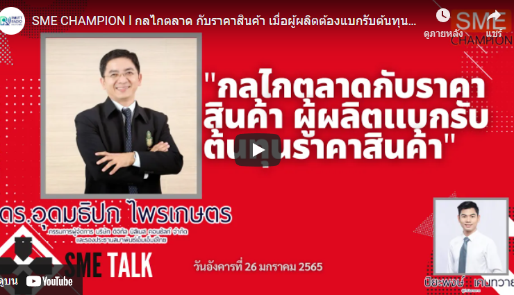 SME CHAMPION l กลไกตลาด กับราคาสินค้า เมื่อผู้ผลิตต้องแบกรับต้นทุนราคาสินค้าที่สูงขึ้น . ติดตามข่าวสารการส่งเสริม SME กับ ดร.อุดมธิปก ไพรเกษตร กรรมการผู้จัดการ บริษัท ดิจิทัลบิสิเนส คอนซัลท์ จำกัด และเลขาธิการสมาพันธ์เอสเอ็มอีไทย . ดำเนินรายการโดย ปิยะพงษ์ เคนทวาย [26 มกราคม 2565] #SME_Champion, #วิทยุราชมงคลธัญบุรี, #SME, #เอสเอ็มอี, ...