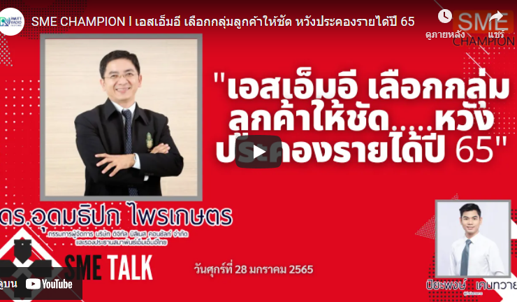 SME CHAMPION l เอสเอ็มอี เลือกกลุ่มลูกค้าให้ชัด หวังประคองรายได้ปี 65 . ติดตามข่าวสารการส่งเสริม SME กับ ดร.อุดมธิปก ไพรเกษตร กรรมการผู้จัดการ บริษัท ดิจิทัลบิสิเนส คอนซัลท์ จำกัด และเลขาธิการสมาพันธ์เอสเอ็มอีไทย . ดำเนินรายการโดย ปิยะพงษ์ เคนทวาย [28 มกราคม 2565] #SME_Champion, #วิทยุราชมงคลธัญบุรี, #SME, #เอสเอ็มอี, ...