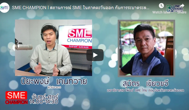 SME CHAMPION l สถานการณ์ SME ในภาคตะวันออก กับการระบาดระลอกใหม่ของ COVID-19 ในช่วง SME TALK วันนี้คุยกับ คุณสุมิตร เขียวขจี (เลขาธิการสมาพันธ์เอสเอ็มอีไทย กลุ่มภาคตะวันออก) [20 มกราคม 2564] เวลา 14.20-14.30 น. ทางวิทยุราชมงคลธัญบุรี ดำเนินรายการโดย และปิยะพงษ์ เคนทวาย ...