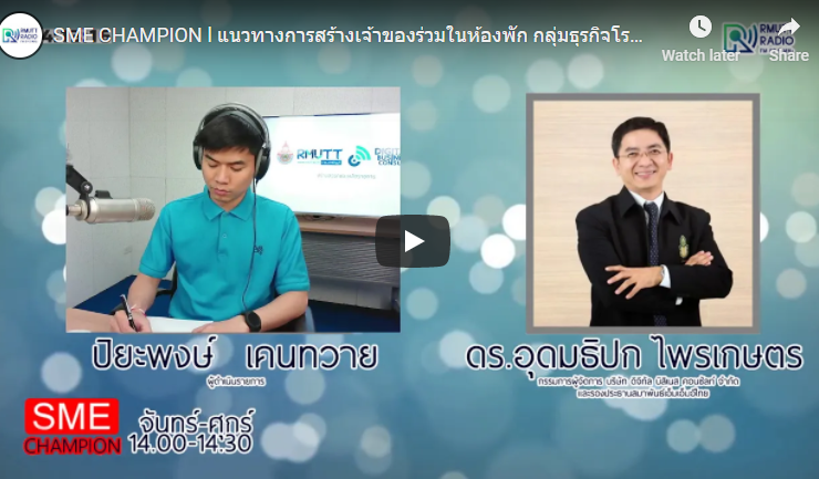 SME CHAMPION l แนวทางการสร้างเจ้าของร่วมในห้องพัก กลุ่มธุรกิจโรงแรม ไอเดียการแก้ปัญหาขาดสภาพคล่อง ติดตามข่าวสารการส่งเสริม SME กับ ดร.อุดมธิปก ไพรเกษตร กรรมการผู้จัดการ บริษัท ดิจิทัลบิสิเนส คอนซัลท์ จำกัด และปิยะพงษ์ เคนทวาย . [19 มกราคม 2564] #SME_Champion, #วิทยุราชมงคลธัญบุรี, #SME, #เอสเอ็มอี, ...