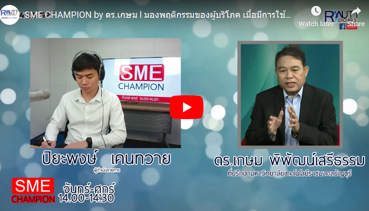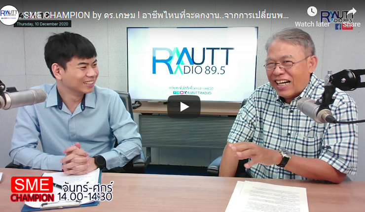SME CHAMPION by ดร.เกษม l อาชีพไหนที่จะตกงาน..จากการเปลี่ยนพฤติกรรมผู้โภค ผลกระทบจาก COVID-19 ตอน 1 ในช่วง SME TALK โดย ดร.เกษม พิพัฒน์เสรีธรรม กรรมการผู้จัดการบริษัท 40 เค แอนด์ พี จำกัด และที่ปรึกษามหาวิทยาลัยเทคโนโลยีราชมงคลธัญบุรี สนใจอ่านบทความทั้งหมดของ ดร.เกษม พิพัฒน์เสรีธรรม จากหนังสือ “ตังค์หาง่าย” ติดต่อได้ทกับทีมงานรายการ SME CHAMPION [10 ธันวาคม 2563] ดำเนินรายการโดย ปิยะพงษ์ เคนทวาย #SME_Champion, #วิทยุราชมงคลธัญบุรี, #SME, ...