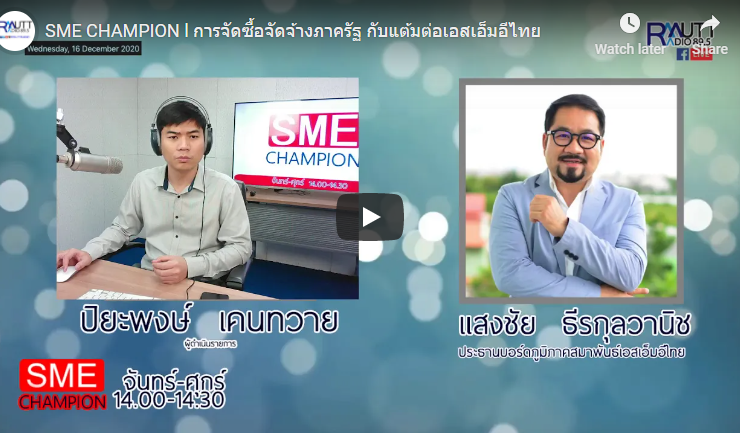 SME CHAMPION l การจัดซื้อจัดจ้างภาครัฐ กับแต้มต่อเอสเอ็มอีไทย ช่วง SME TALK พูดคุยกับ คุณแสงชัย ธีรกุลวาณิช (เลขาธิการสมาพันธ์เอสเอ็มอีไทย และประธานสมาพันธ์เอสเอ็มอีไทย ส่วนภูมิภาค ติดตามข่าวสารการส่งเสริม SME กับ ดร.อุดมธิปก ไพรเกษตร กรรมการผู้จัดการ บริษัท ดิจิทัลบิสิเนส คอนซัลท์ จำกัด และปิยะพงษ์ เคนทวาย . (16 ธันวาคม 2563] #SME_Champion, #วิทยุราชมงคลธัญบุรี, #SME, #เอสเอ็มอี, ...
