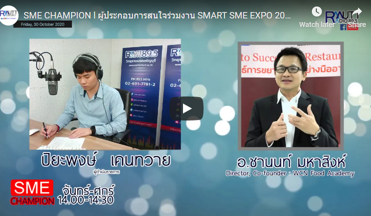 SME CHAMPION l ผู้ประกอบการสนใจร่วมงาน SMART SME EXPO 2020 อย่างคึกคัก ทั้งชมบูธและร่วมฟังเสวนา ในช่วง SME TALK วันนี้คุยกับ อ.ชานนท์ มหาสิงห์ Director Co-Founder, WCN Food Academy (30 ตุลาคม 2563] เวลา 14.20-14.30 น. ติดตามบทวิเคราะห์จาก อ.ชานนท์ มหาสิงห์ ได้ทุกวันศุกร์ ทางวิทยุราชมงคลธัญบุรี ดำเนินรายการโดย และปิยะพงษ์ เคนทวาย ...